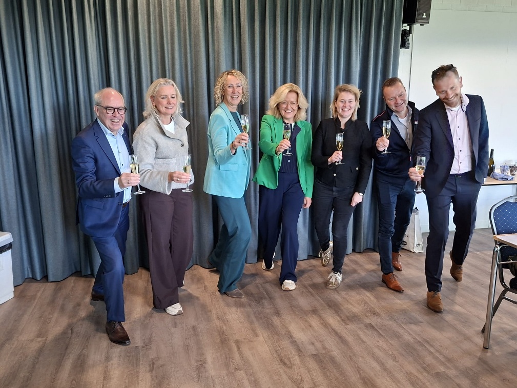 Marlous Siemelink-Amse, schoolbestuur De Mare, Moniek Haafkes, bestuur de Bieënkorf, Judith Compagner, wethouder onderwijs gemeente Olst-Wijhe, Leonie Meuwszen, aannemer BINX, Frank Visser, aannemer BINX en Bart de Grunt, schoolbestuur mijnplein.