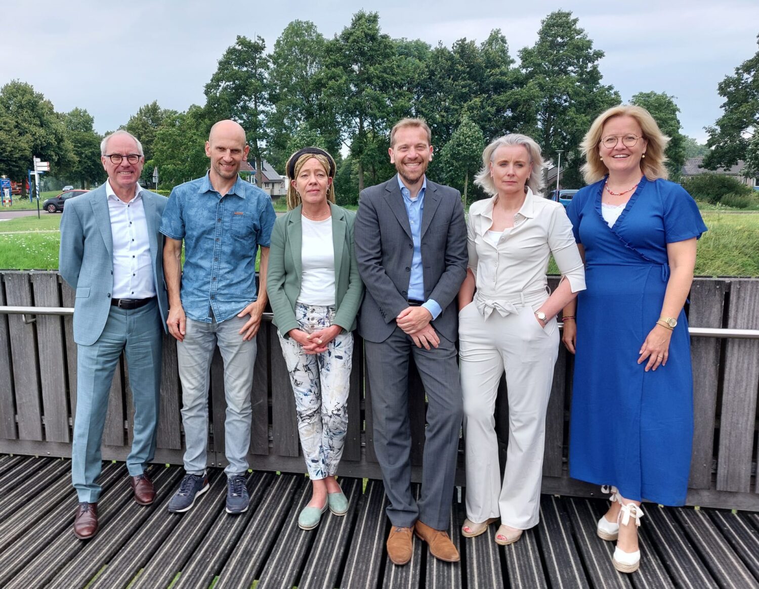 Op de foto v.l.n.r.: Donald van der Veen (Stichting Maatschappelijk Vastgoed (SMV)), Joost Versluis (Jansman Bouw), Inge Tijdhof (kinderopvangorganisatie KOOS), Bart de Grunt (schoolbestuur mijnplein bijzonder onderwijs, Marlous Siemelink-Amse (schoolbestuur De Mare openbaar onderwijs en Judith Compagner (wethouder gemeente Olst-Wijhe).