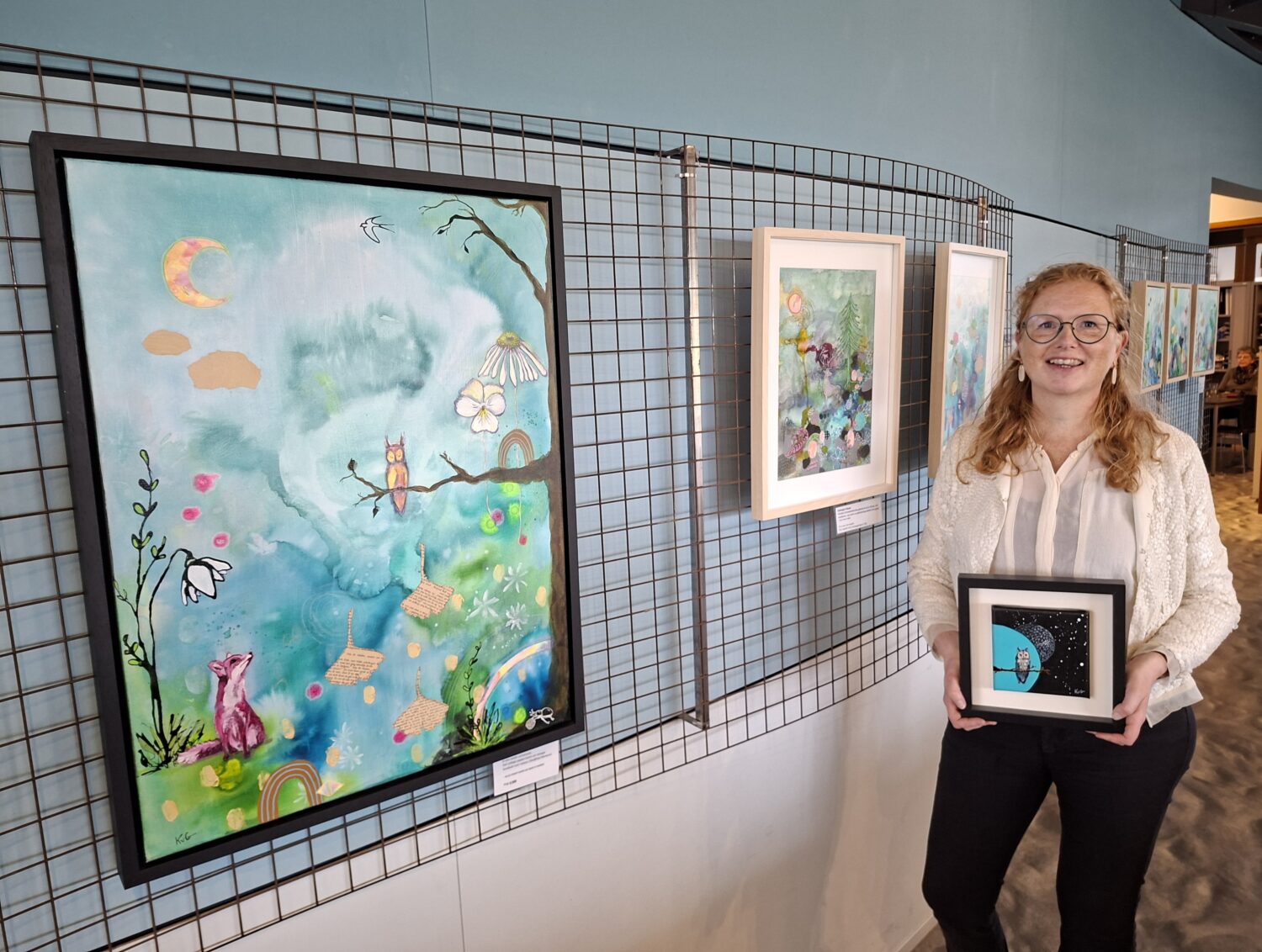 De expositie toont een selectie van haar kleurrijke, dromerige schilderijen, waarin natuur en verbeelding samenkomen. Kirsten werkt met een combinatie van materialen, waaronder acrylverf, aquarel, inkt, krijt en collagefragmenten uit een vintage boekje. Dit zorgt voor een gelaagd werk met zachte contrasten en verrassende details. Bezoekers omschrijven haar werk als speels en ‘een warm bad om in weg te zakken’. Kirsten woont in het buitengebied van polder Nijbroek, aan de overzijde van de IJssel. De natuur in de IJsselvallei en Veluwe vormt een belangrijke inspiratiebron. “Mijn liefde voor dieren en planten zit in al mijn werk,” vertelt ze. Haar schilderijen nodigen uit tot vertragen en langer kijken.